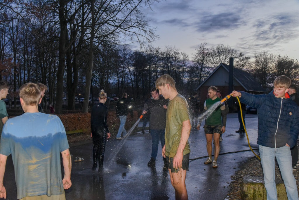 Efter en intens tur gennem mudder og vand blev dagen rundet af med en velfortjent afvaskning med vandslangen, til stor fornøjelse for både deltagere og tilskuere.