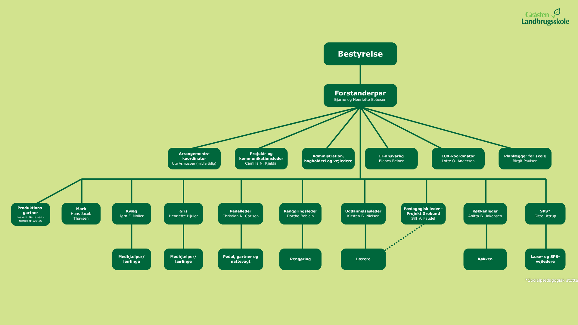 Vi lægger stor vægt på en flad struktur, med kort afstand mellem leder og medarbejder. Fra leder, mellemleder og stabsfunktioner er der heller ikke langt til den øverste myndighed. Vi ser en flad struktur, som et vigtigt element, i den fortsatte udvikling af både skolen og vores produktionslandbrug.