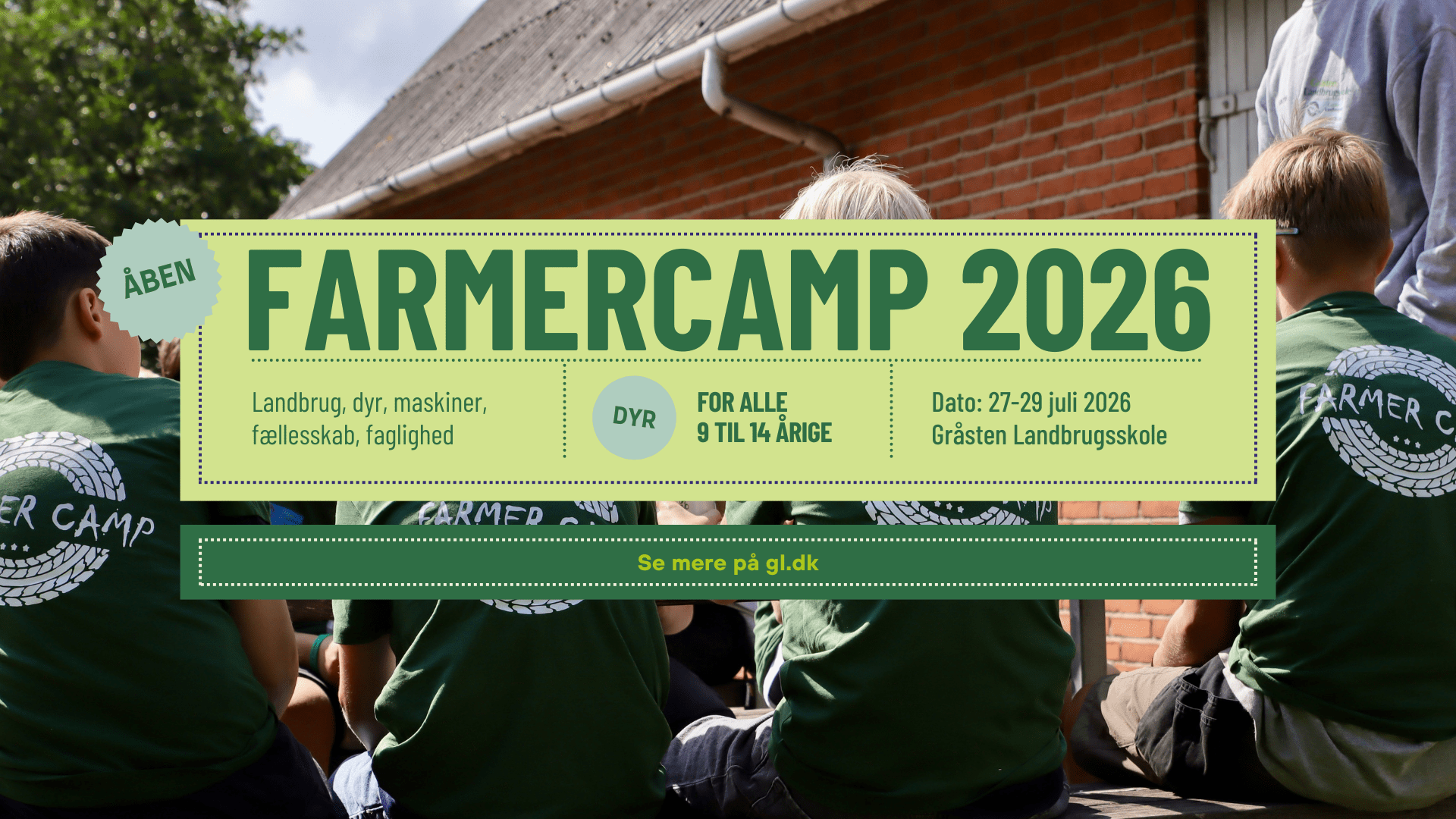 FarmerCampen foregår mandag d. 27. til onsdag d. 29. juli 2026 på Gråsten Landbrugsskole, Fiskbækvej 15, 6300 Gråsten.